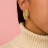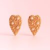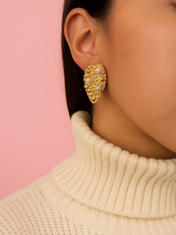 Aretes en bronce con doble baño en oro e incrustaciones de perlas. Aretes medianos con el toque chic en forma de hoja.
