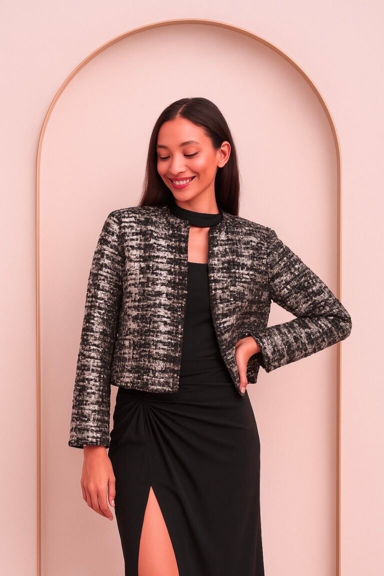 Abrigo corto hecho de tweed y lentejuelas color negro. Tweed
