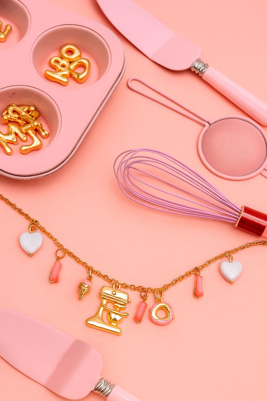 Brazalete en bronce con baño en oro de 18K y charms de pastelería.