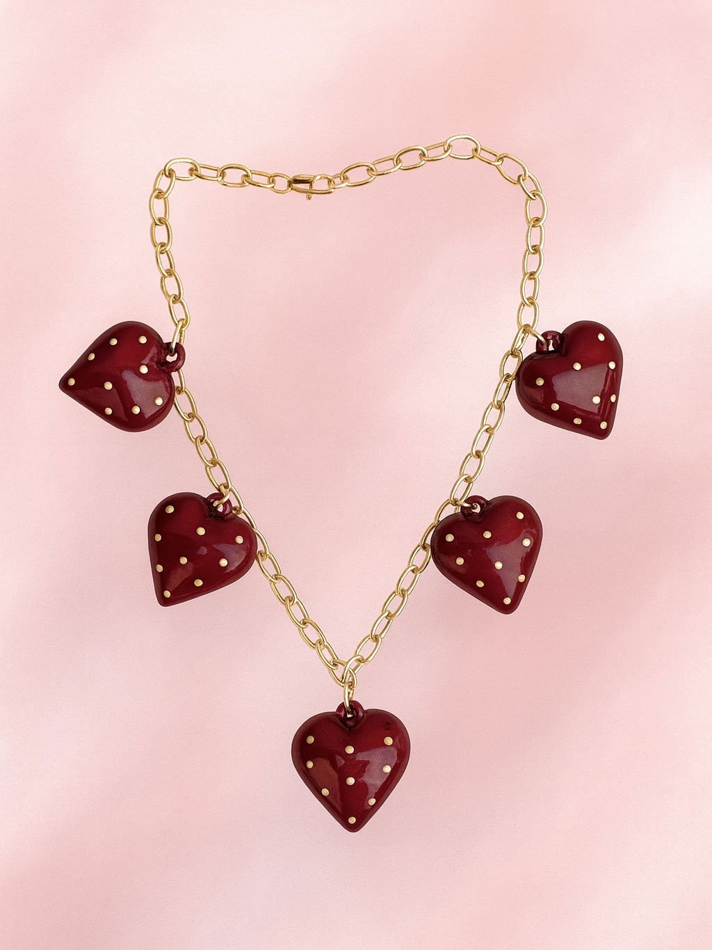 Cadena en bronce con baño en oro de 18 k y dijes con corazón en color rojo.