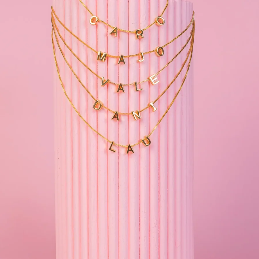 Cadenita de plata con baño en oro y dijes de iniciales hechas en bronce con doble baño en oro. Personalizalo con tu nombre o con los nombres de las personas que amas. 3 letras son 75.000 pesos. Cada adición tiene un valor de $10.000 COP