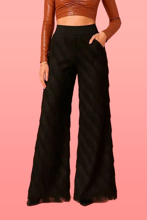 Pantalón con pelo negro bota ancha, ideal para elevar cualquier outfit. Malla con transparencias