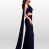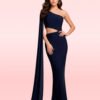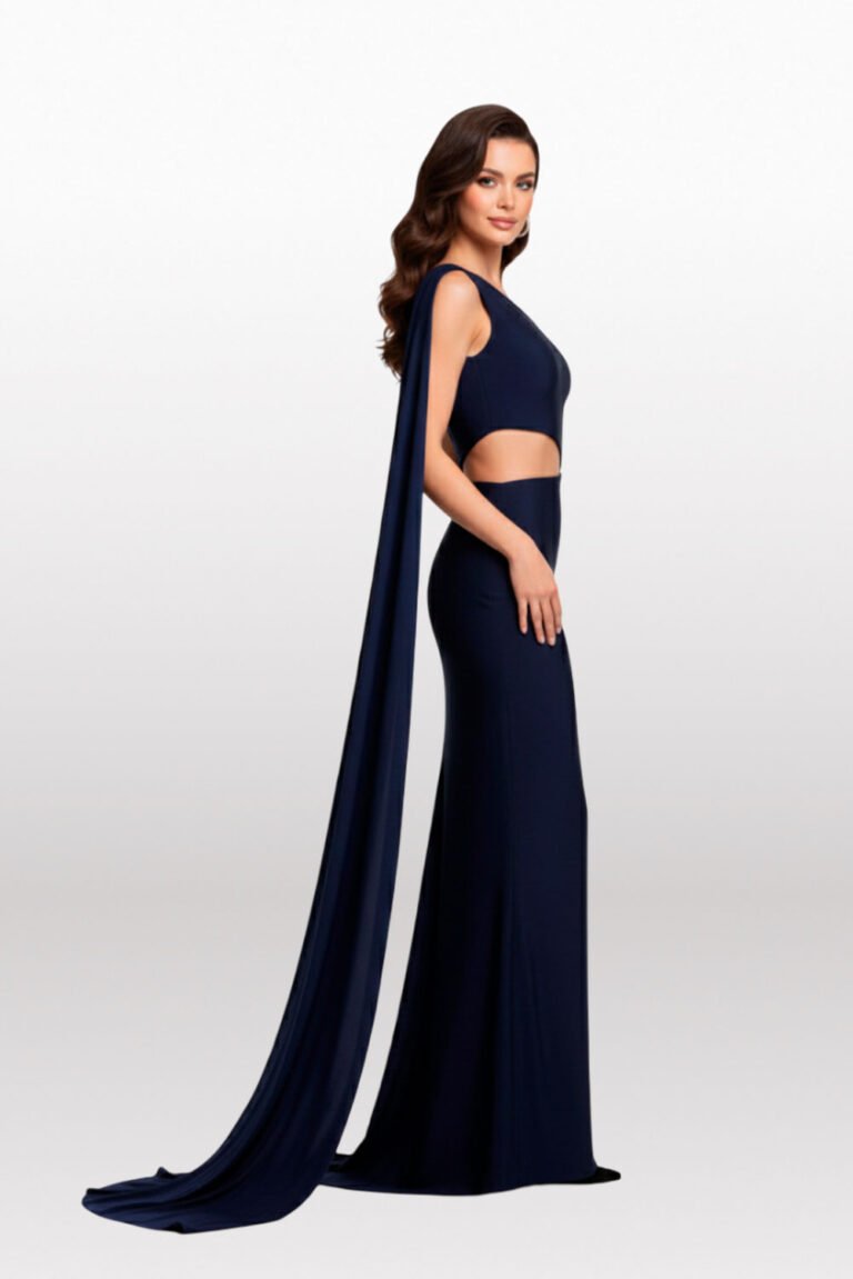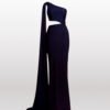 CON UNA CAPA SOBRE EL HOMBRO SOBREPUESTA, TOP ASIMÉTRICO, CON CUT-OUT EN LA ZONA DEL ABDOMEN Y UNA FALDA SEMI ROTONDA LARGA. LYRA A BASE DE NYLON BRILLANTE. LYRA A BASE DE NYLON BRILLANTE