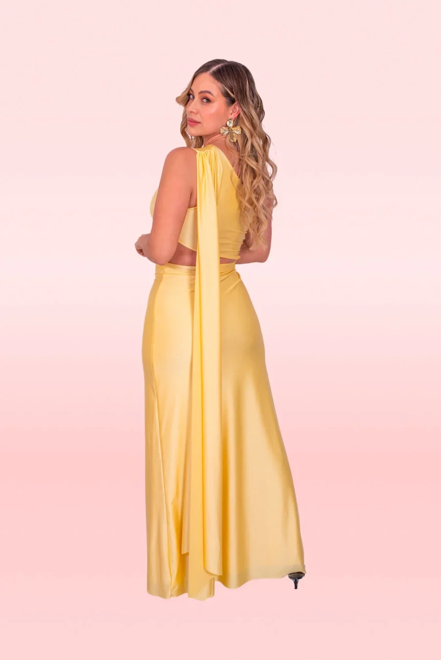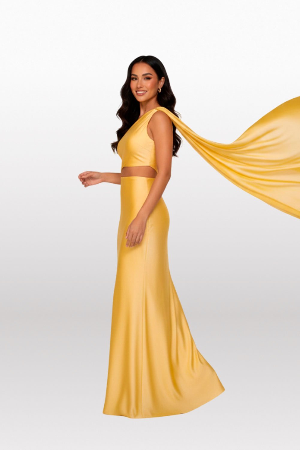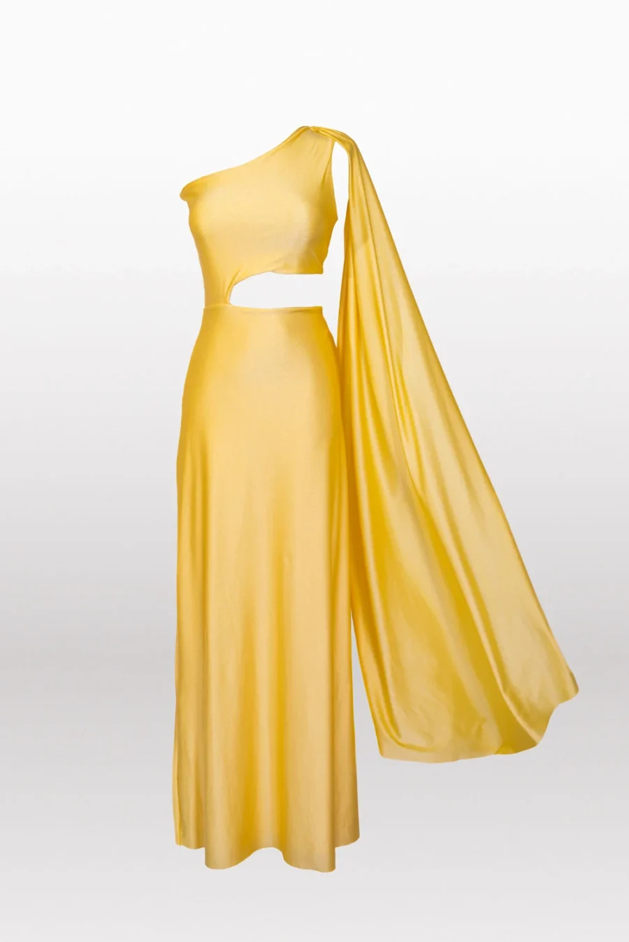 Con una capa sobre el hombro sobrepuesta, top asimétrico, con cut-out en la zona del abdomen y una falda semi rotonda larga. *El tono sol radiante viene forrado para evitar transparencias* Lyra a base de nylon brillante