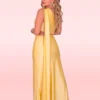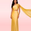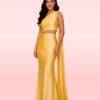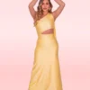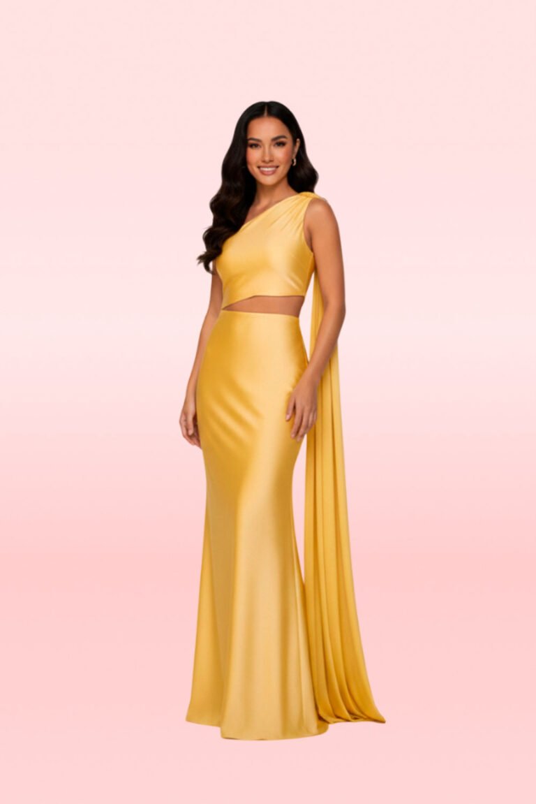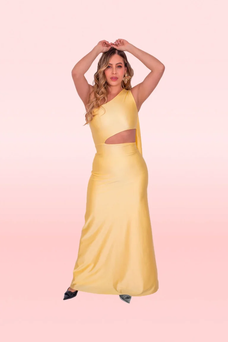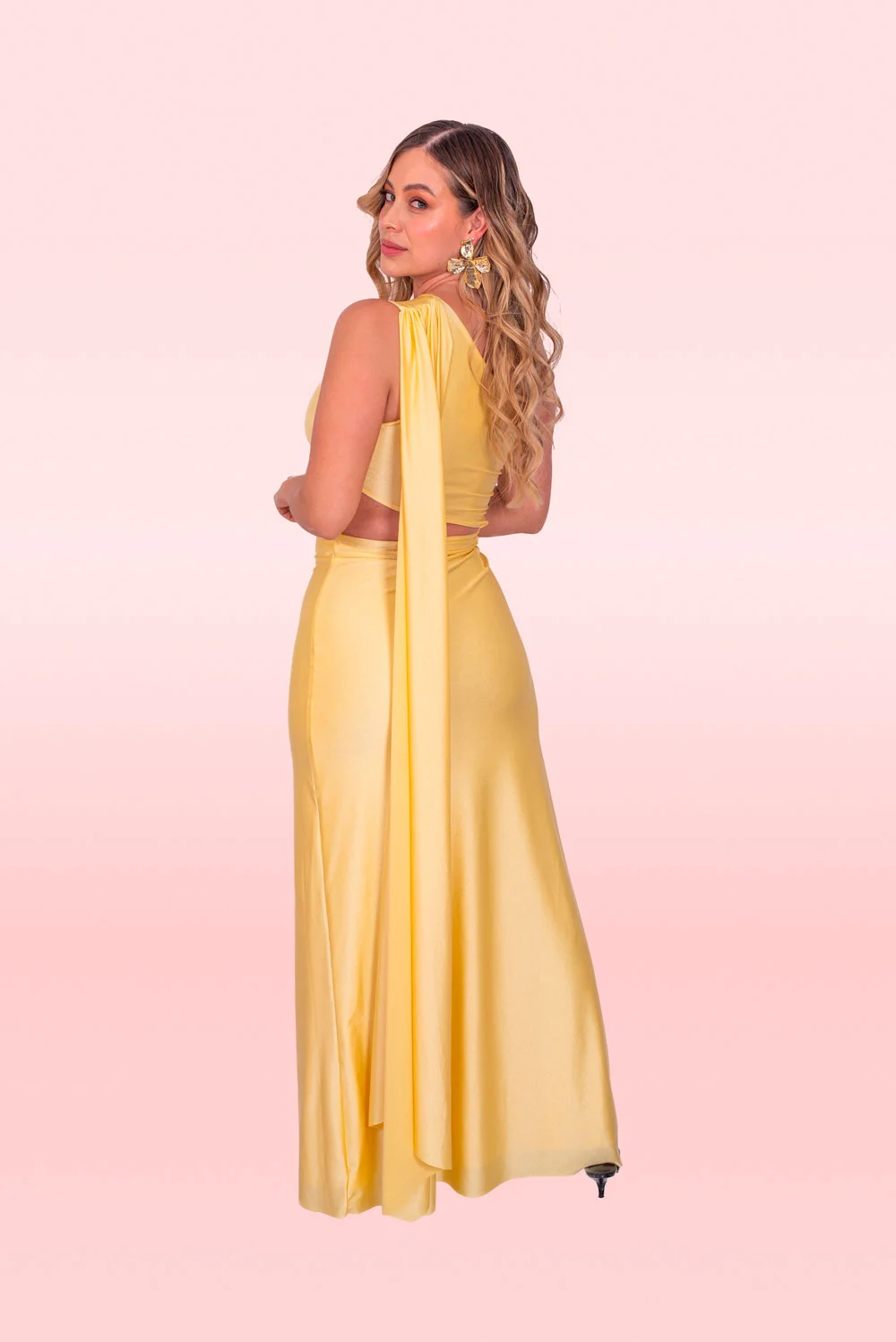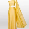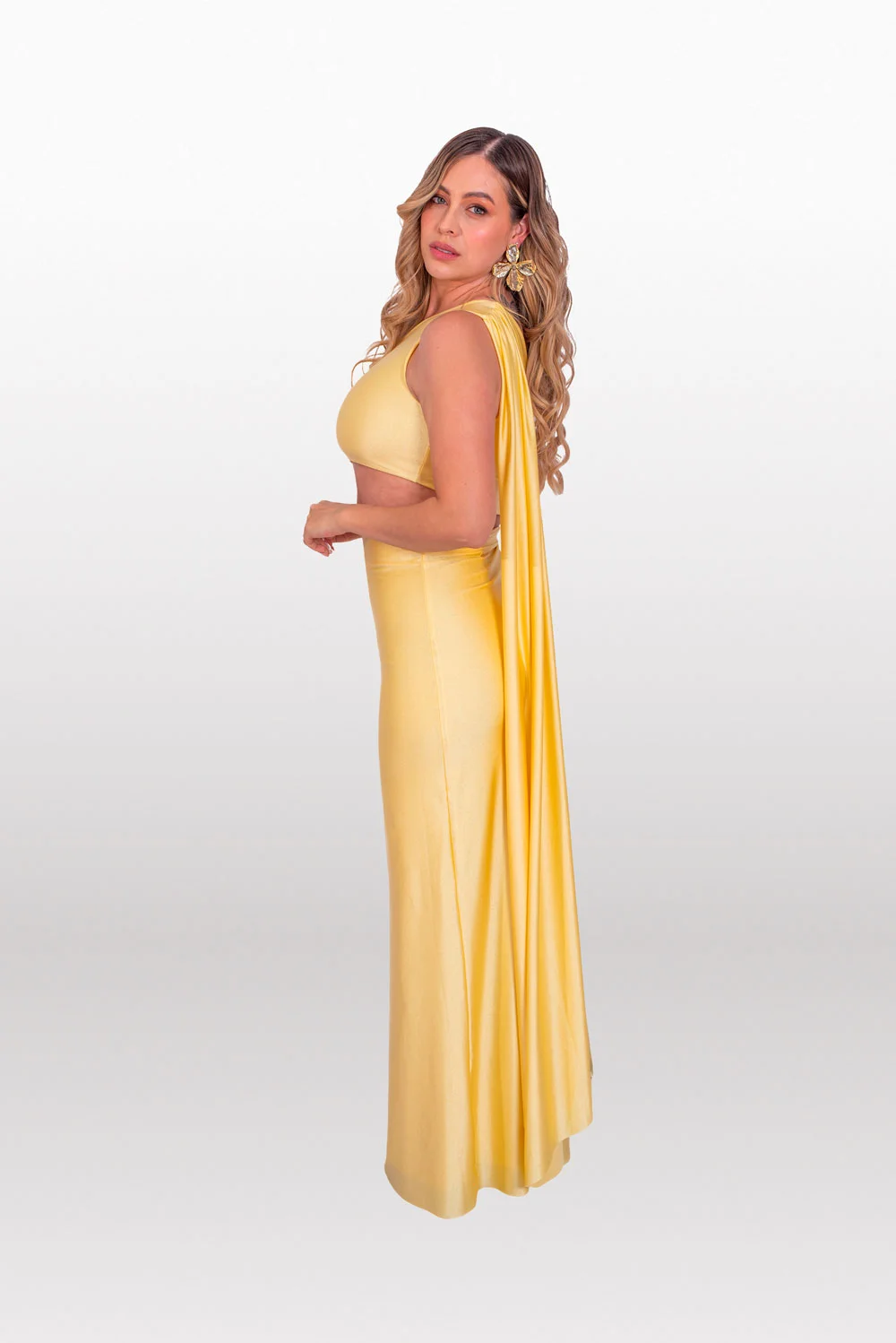 Con una capa sobre el hombro sobrepuesta, top asimétrico, con cut-out en la zona del abdomen y una falda semi rotonda larga. *El tono sol radiante viene forrado para evitar transparencias* Lyra a base de nylon brillante