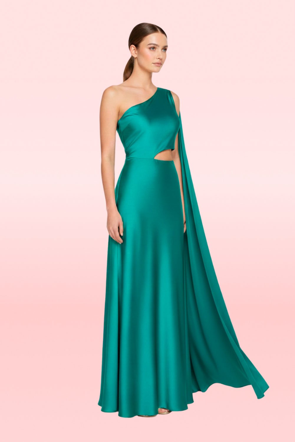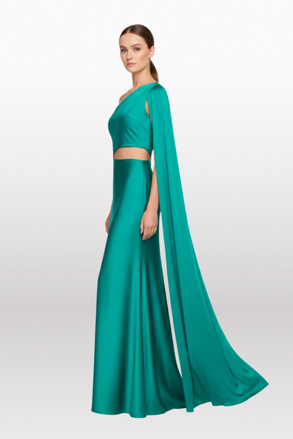 Con una capa sobre el hombro sobrepuesta, top asimétrico, con cut-out en la zona del abdomen y una falda semi rotonda larga. Lyra a base de nylon brillante