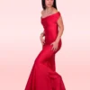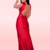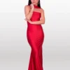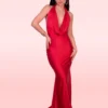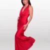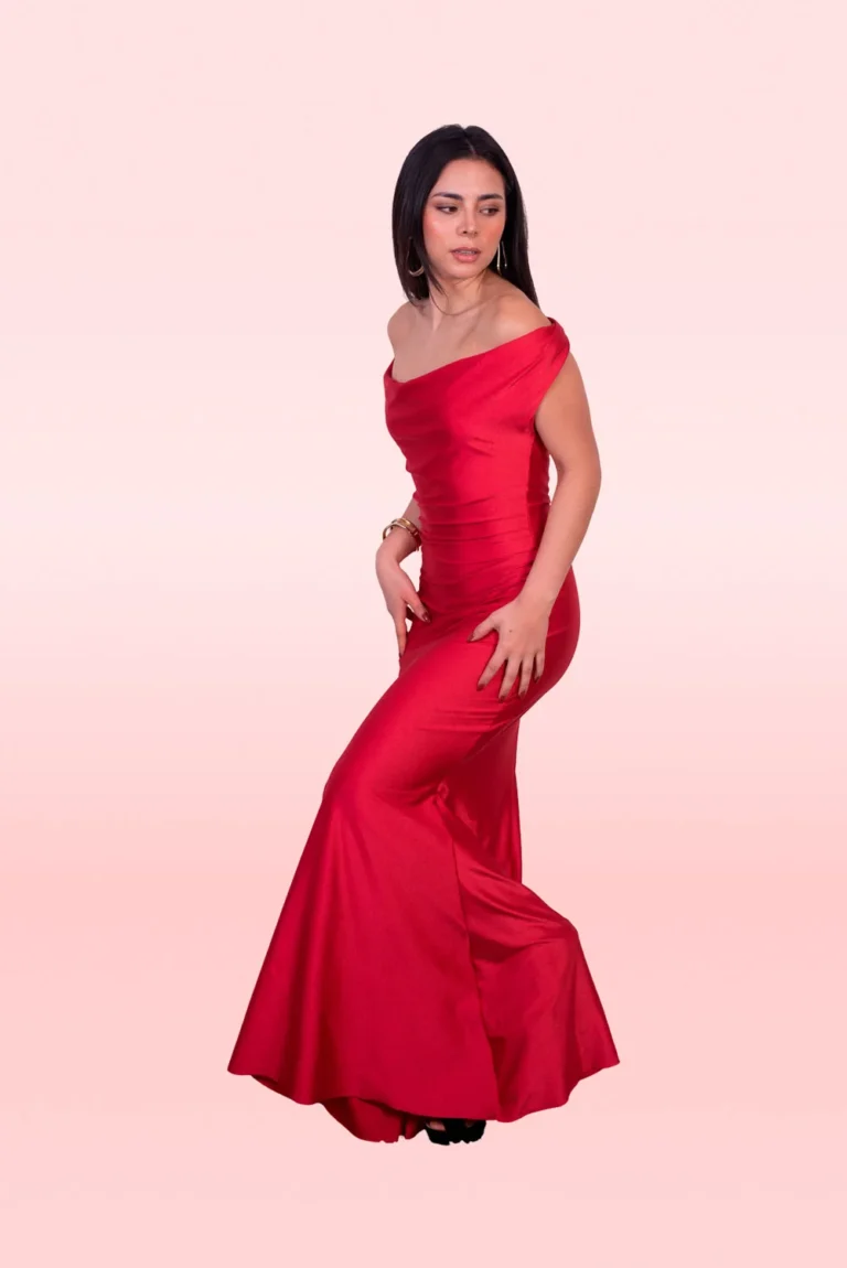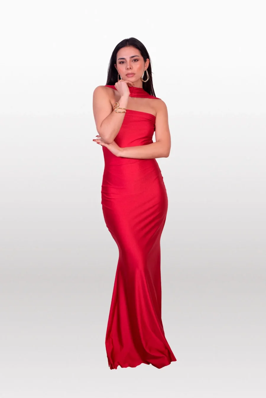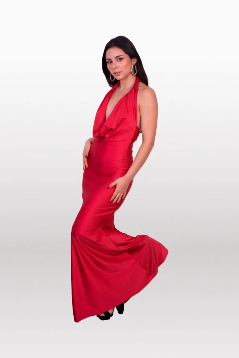 Con 3 formas de uso (escote bandeja, escote drapeado profundo y con cuello), silueta ajustada con falda sirena, escote profundo en V en espalda.
