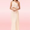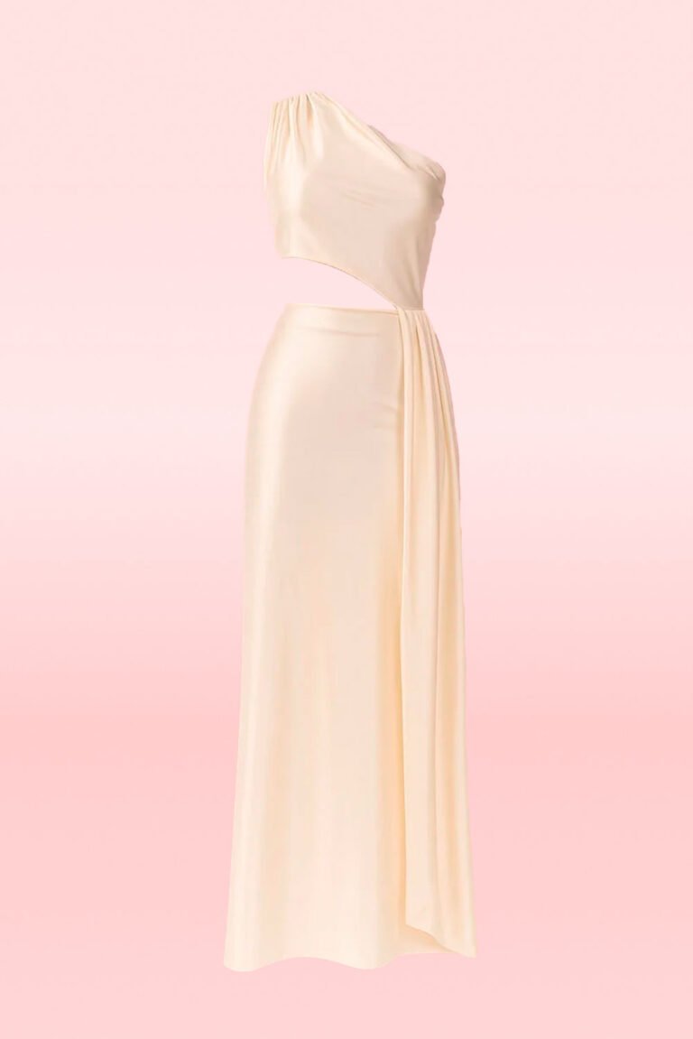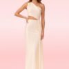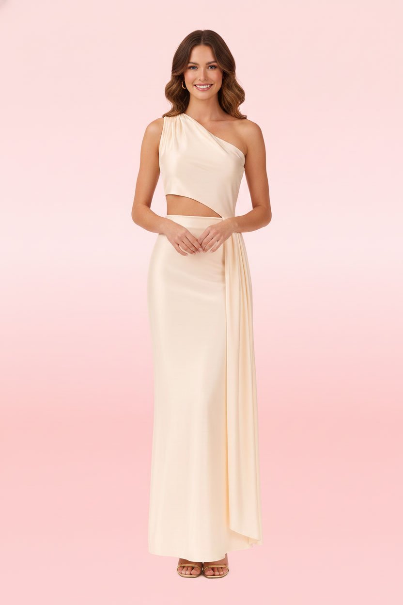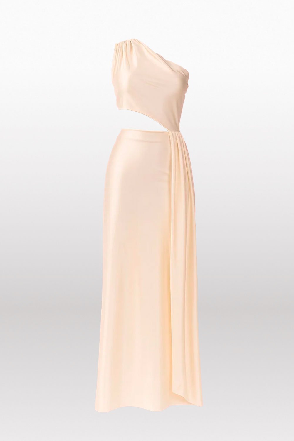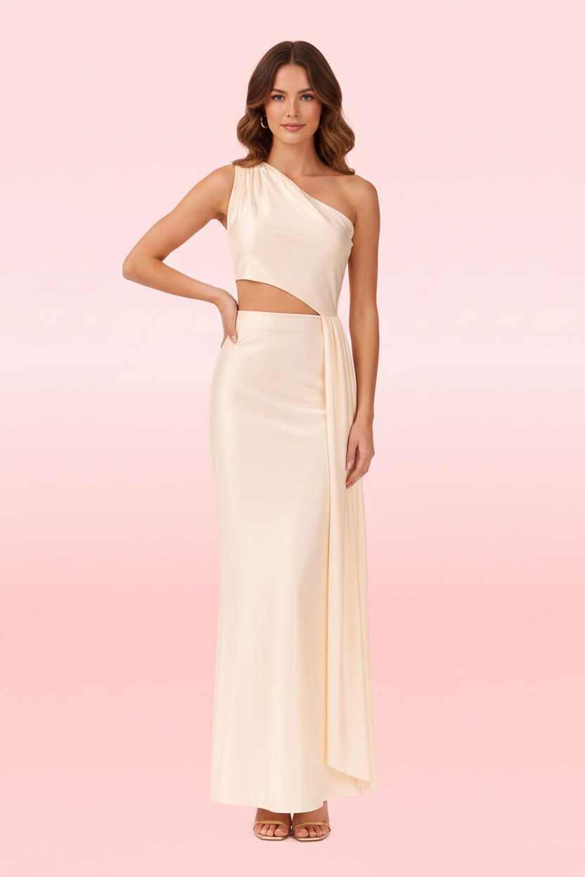 Top asimétrico con recogido en el hombro, cut-out en el abdomen, maxi capa en la cintura, falda tipo A.