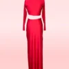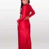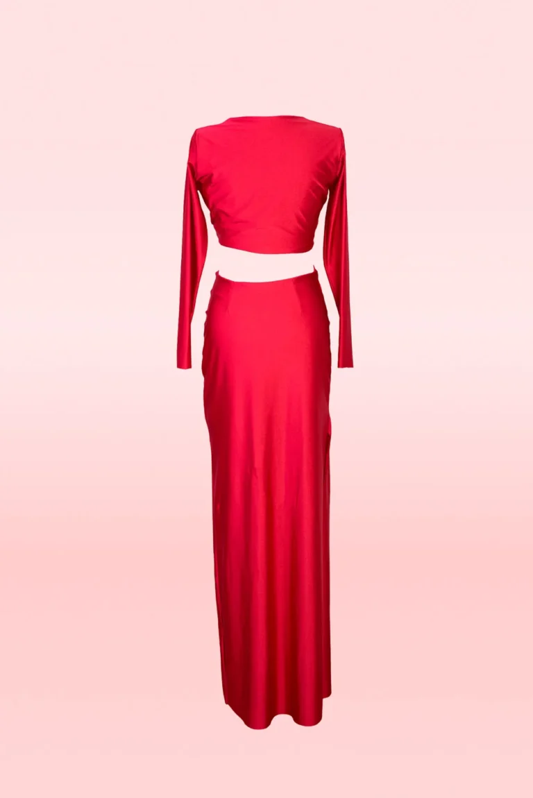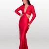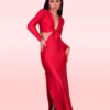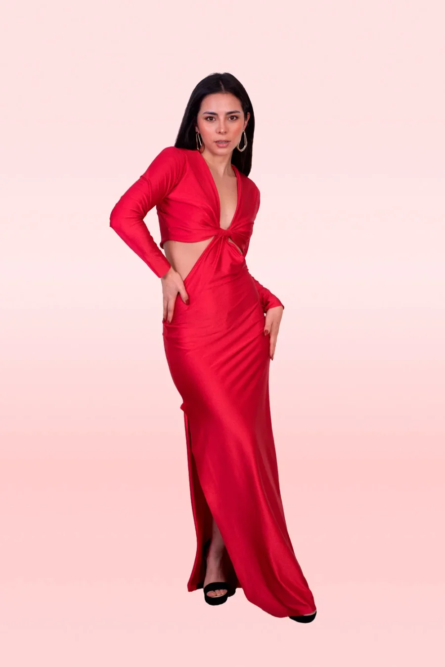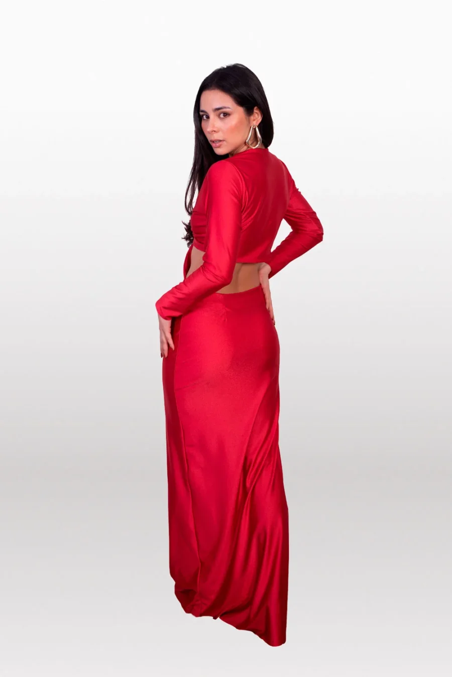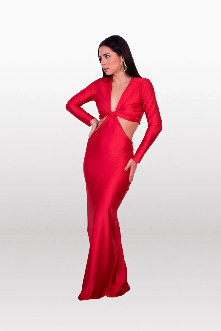 Con mangas ajustadas, escote profundo drapeado, con cut-out en zona de abdomen y espalda. Falda ajustada y abertura en la parte lateral. Lyra a base de nylon brillante