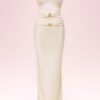 El Palomino se define por un escote strapless de drapeado arquitectónico, un cut-out central sutil y acentos joya en tono dorado que elevan la pieza. Su silueta ceñida y largo maxi componen una estética depurada, sofisticada y atemporal.