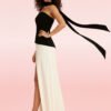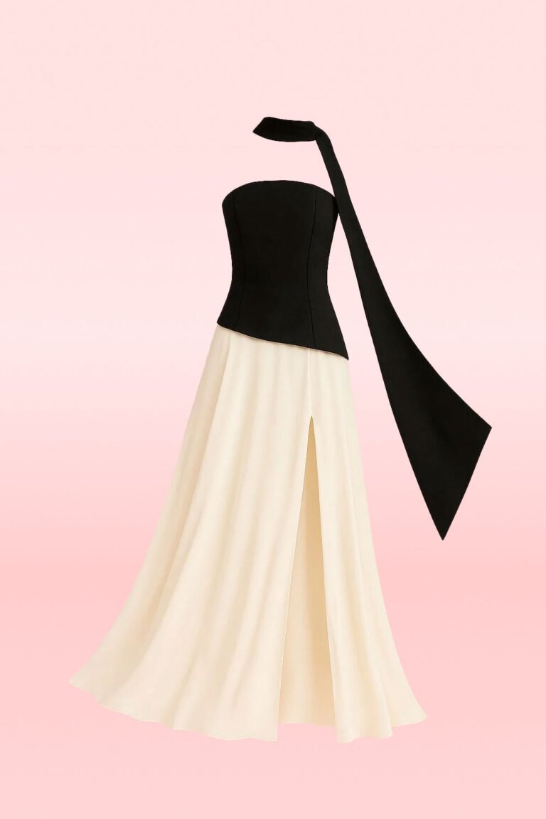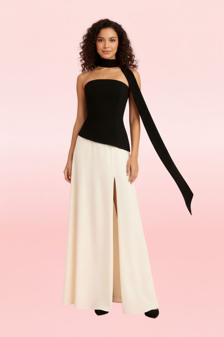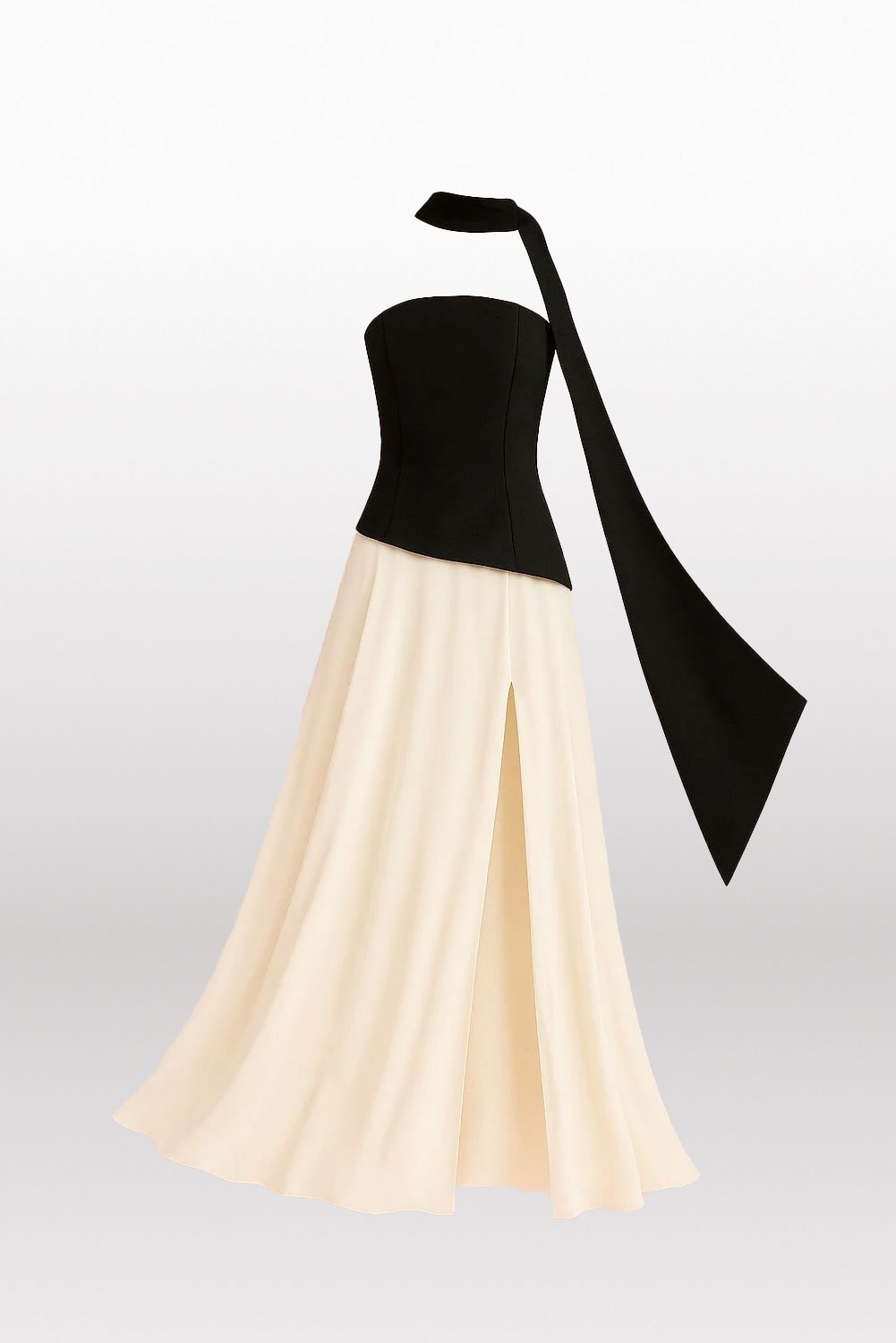 Nuestro Portofino Dress en blanco y negro es la prenda ideal para esos eventos de gala o de noche. Con un bustier para amarrar, falda maxi rotonda con abertura y estola para mayor elegancia. Disponible en talla Ășnica.