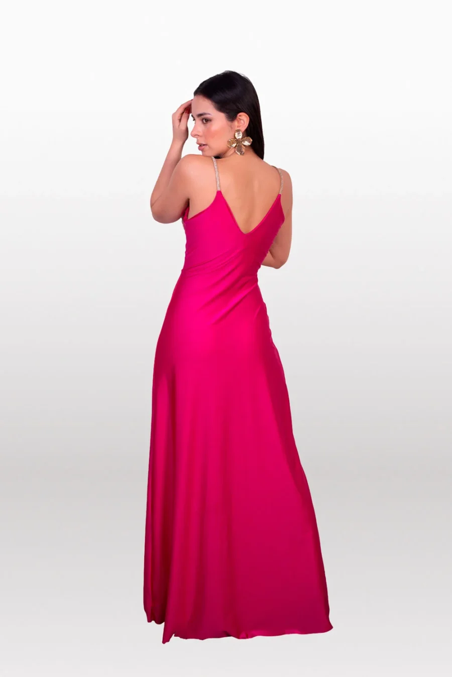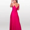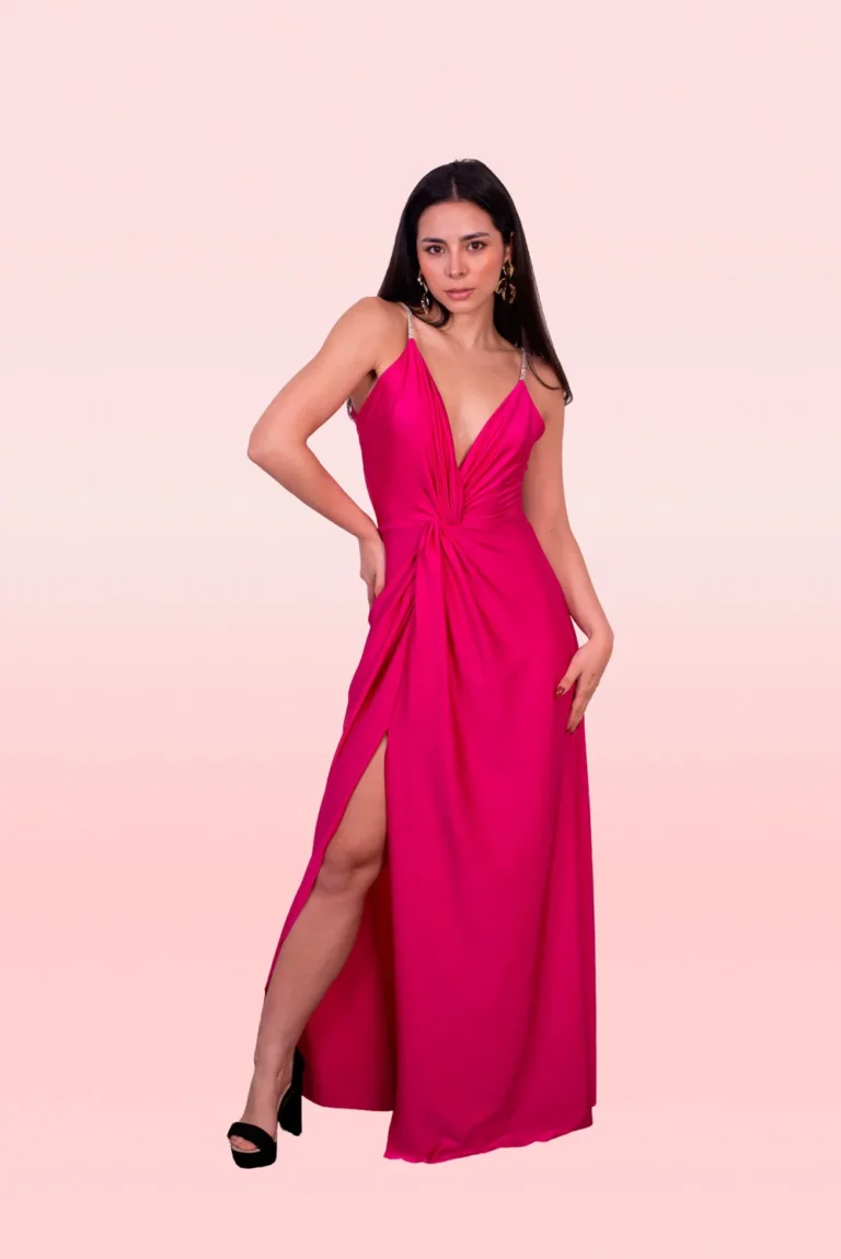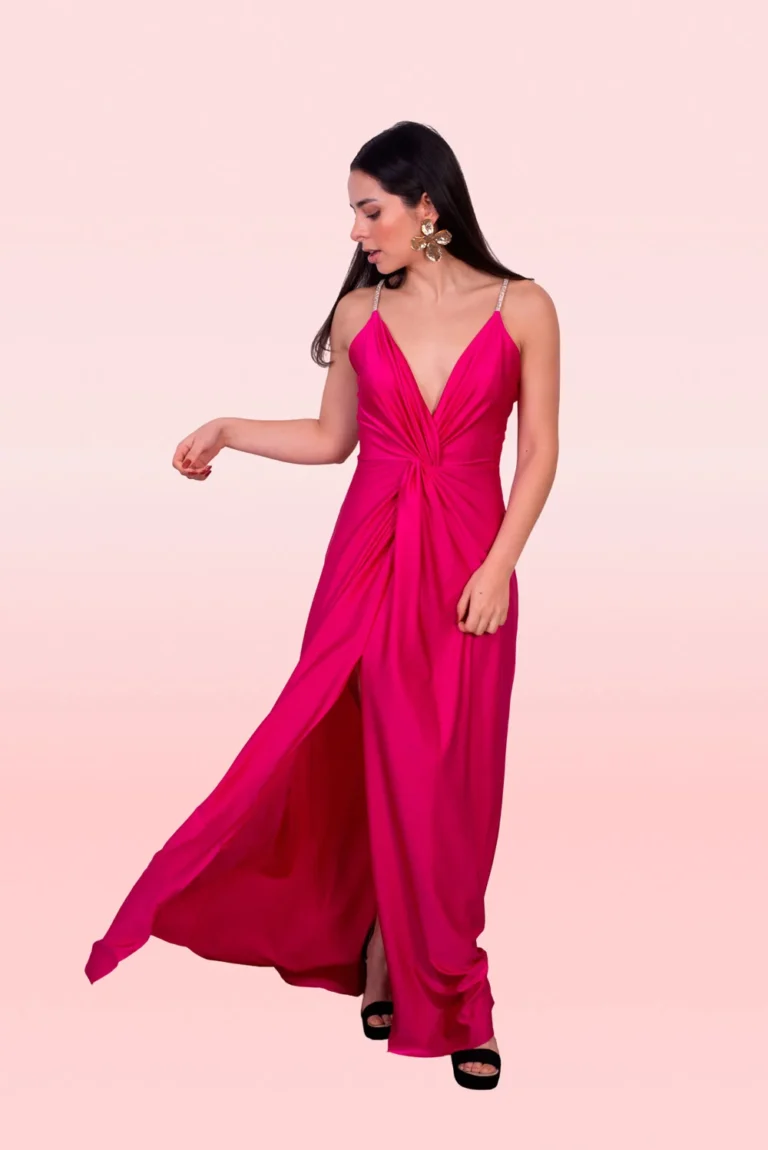 Con escote V drapeado en el delantero, abertura en la parte central y falda recta. La espalda con escote V profundo y tiras con pedrería brillante, perfecto para ocasiones más elegantes.