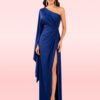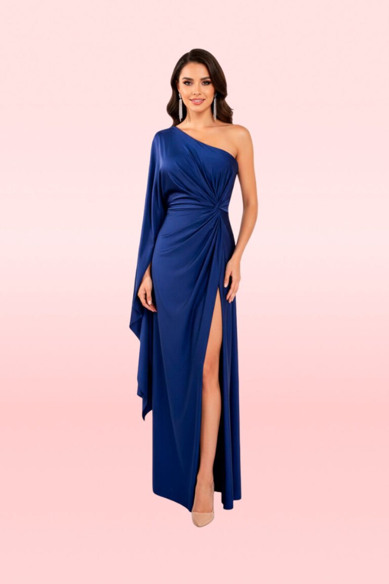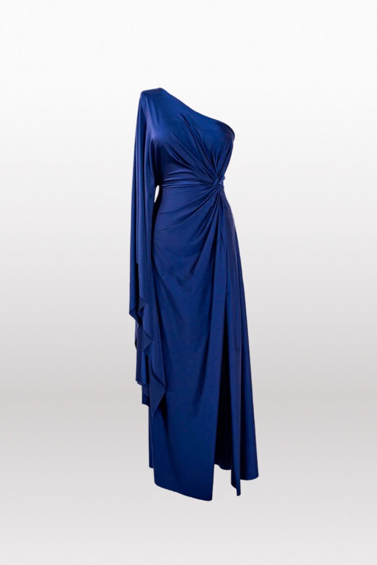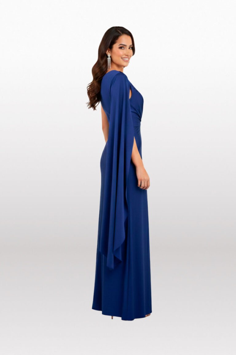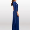 Con una manga amplia, escote cruzado drapeado, falda tipo A con abertura.