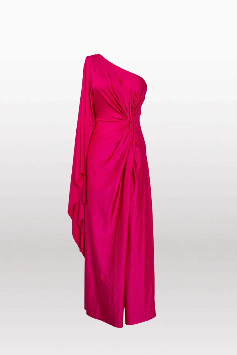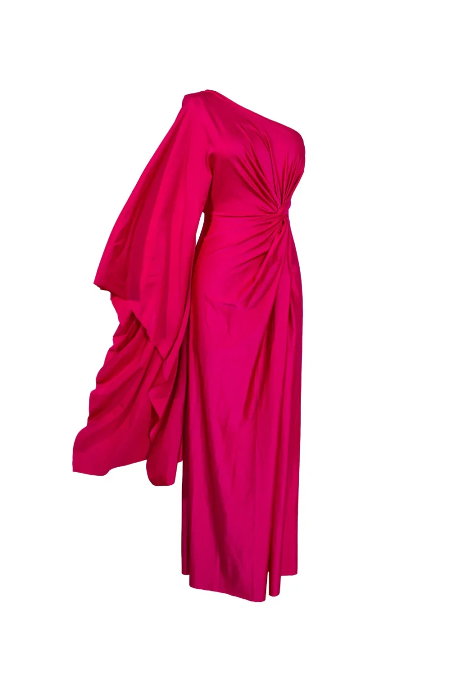 Con una manga amplia, escote cruzado drapeado, falda tipo A con abertura.