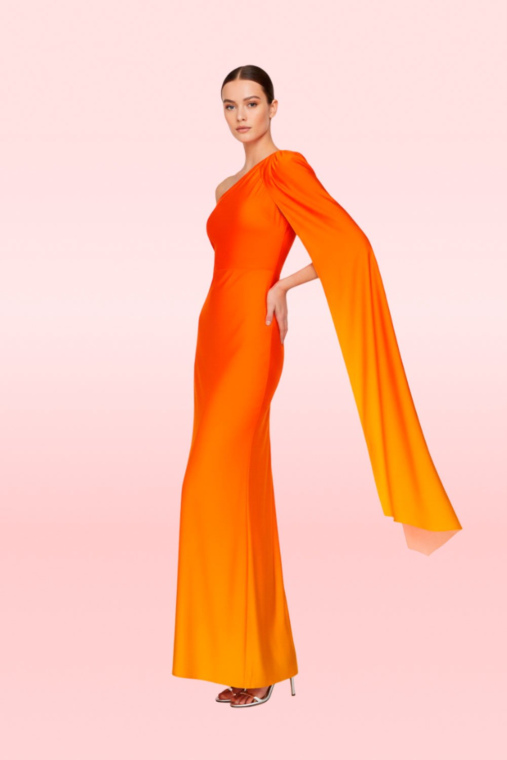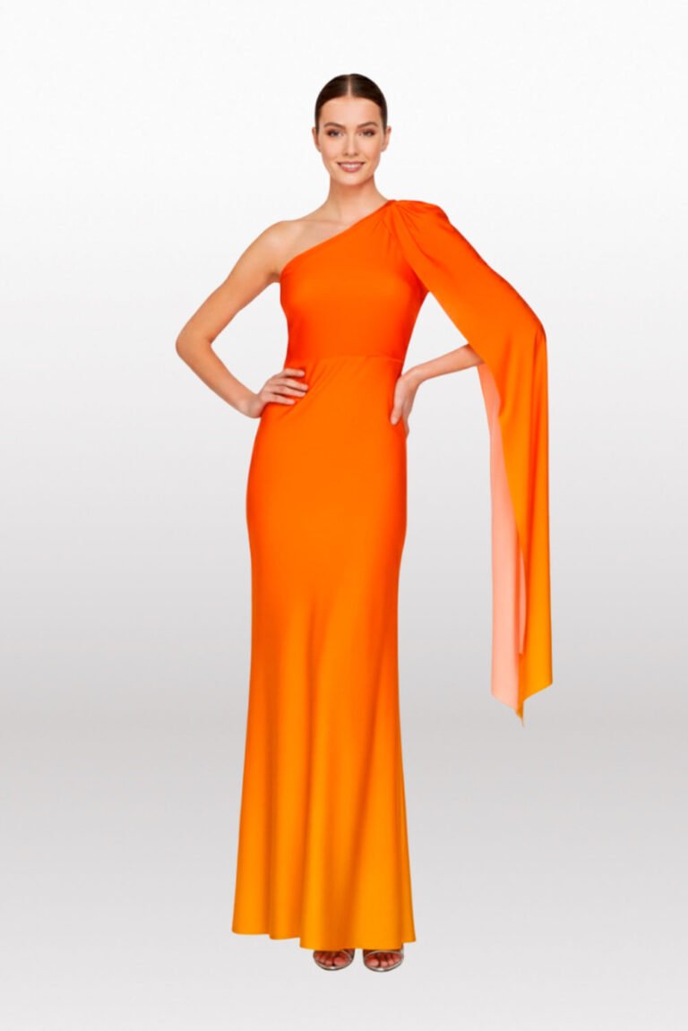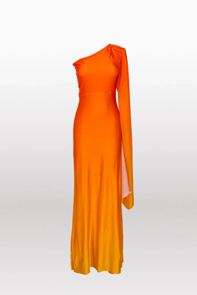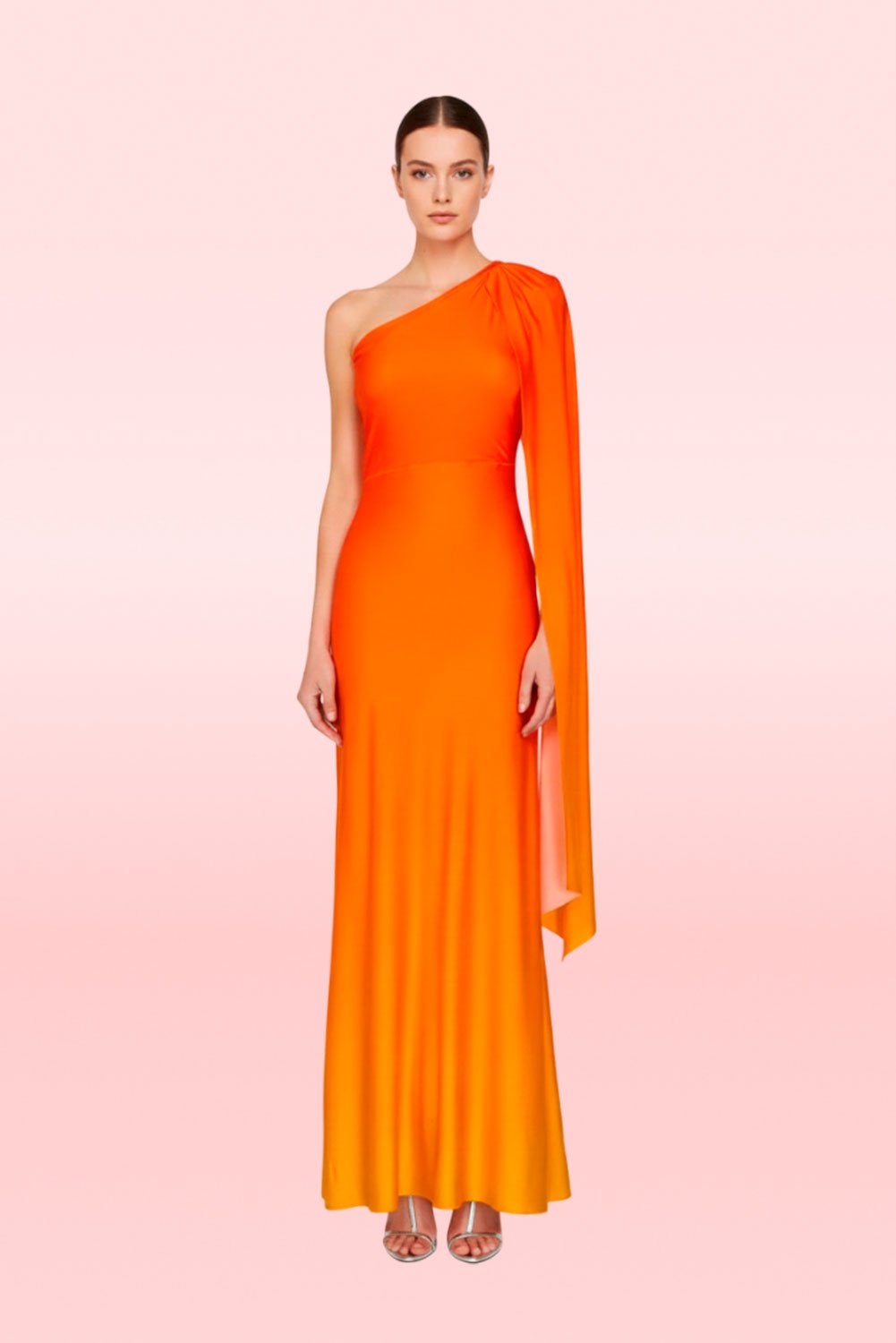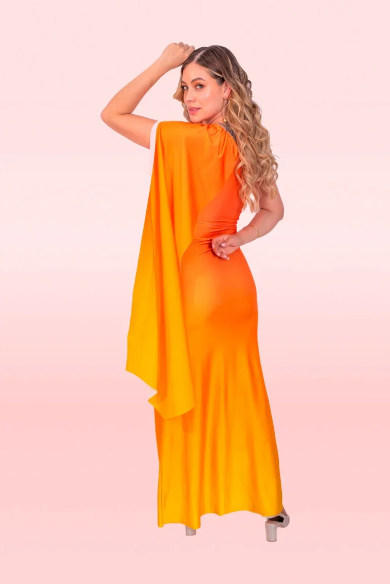 Nuestro vestido con una silueta más ajustada para resaltar tu figura, con capa en el hombro y con un print en degradé amarillo y naranja.