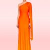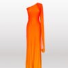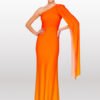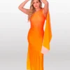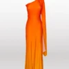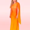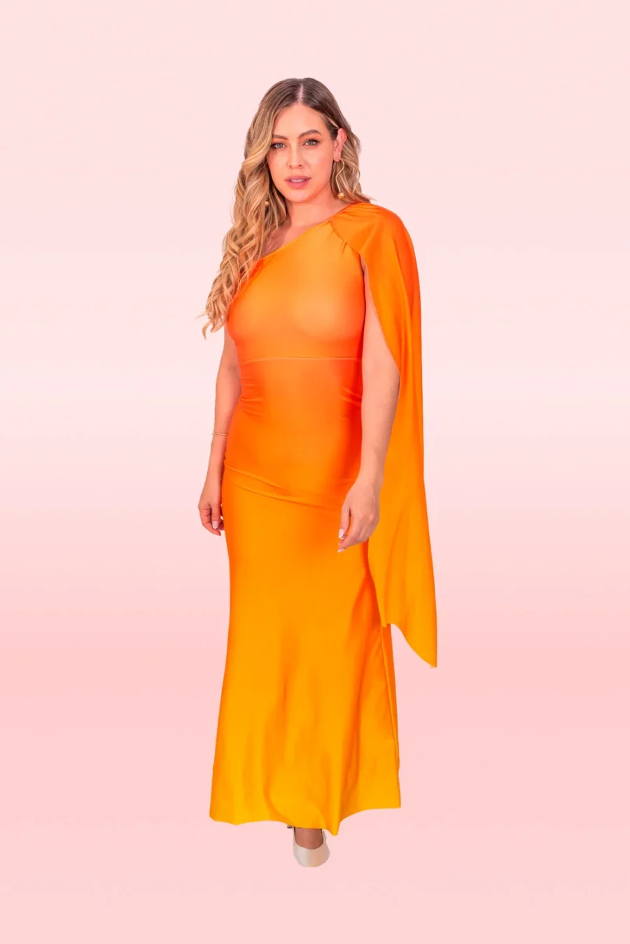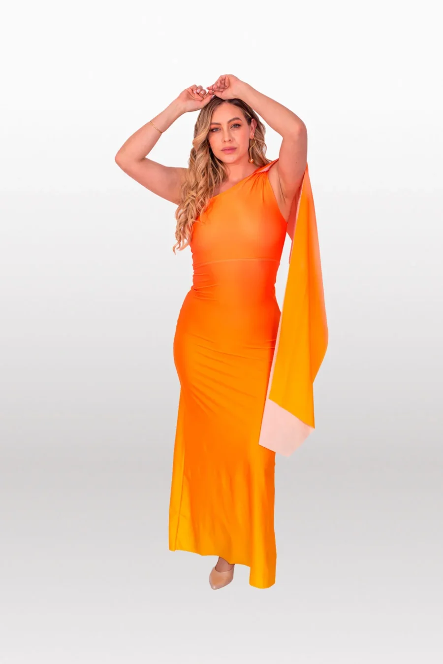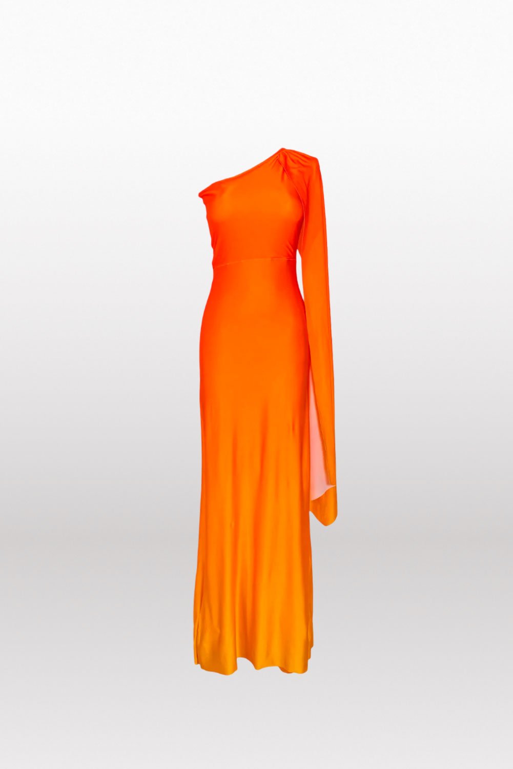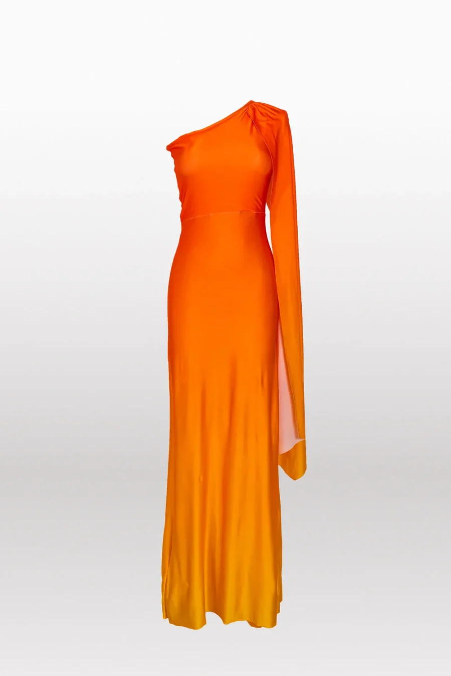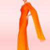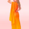 Nuestro vestido con una silueta más ajustada para resaltar tu figura, con capa en el hombro y con un print en degradé amarillo y naranja.