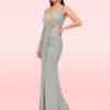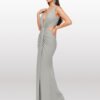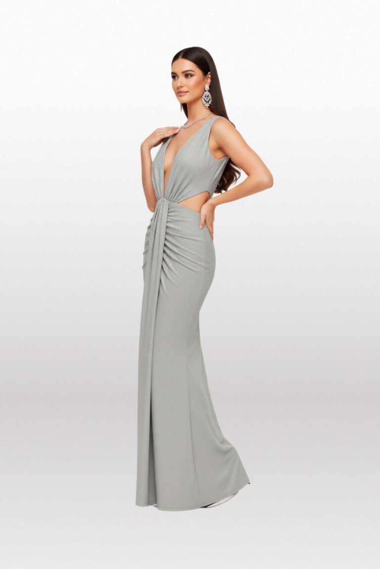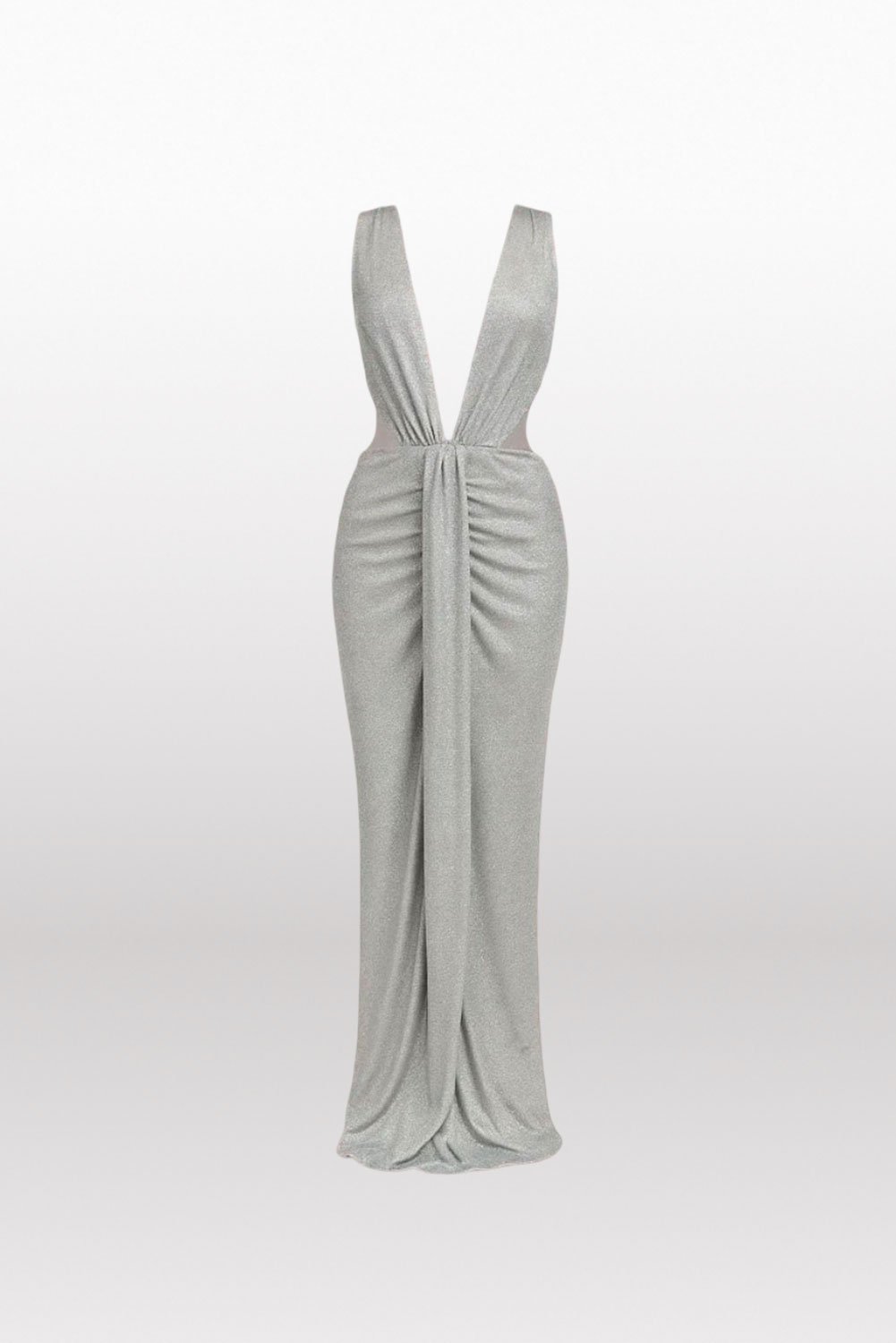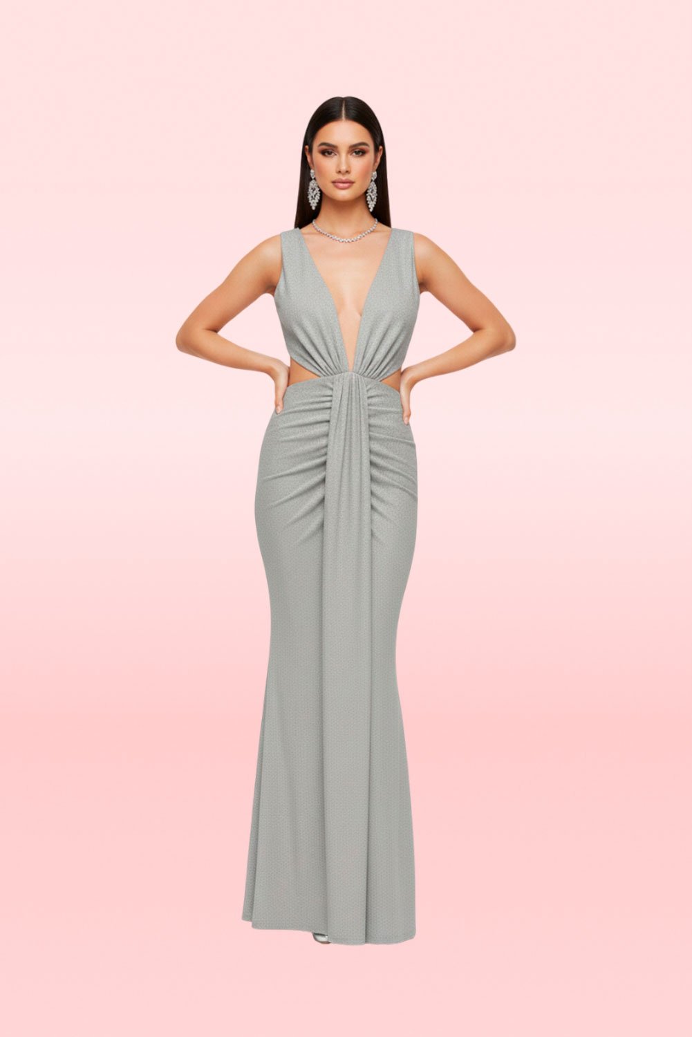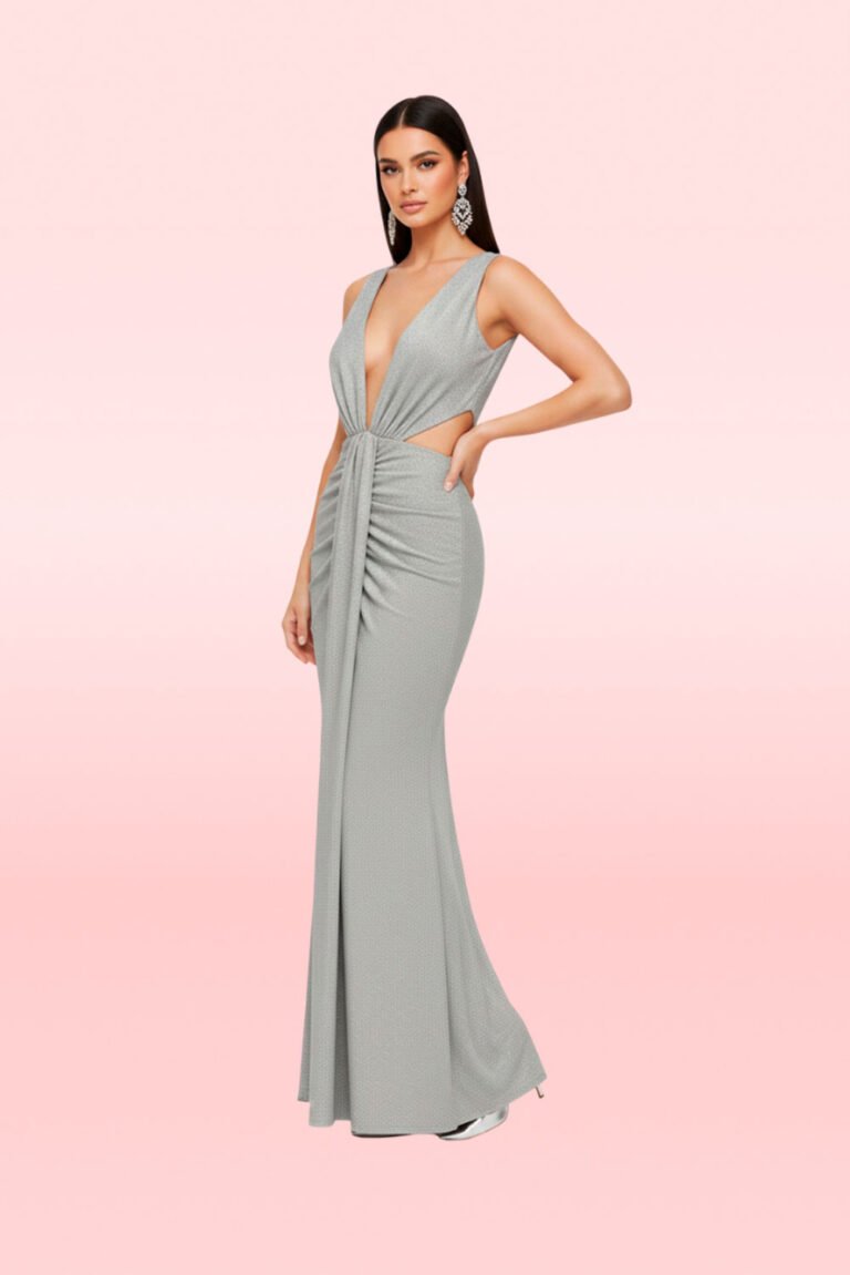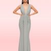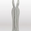 Con escote V drapeado en el delantero, espalda descubierta, falda ajustada drapeada.