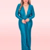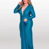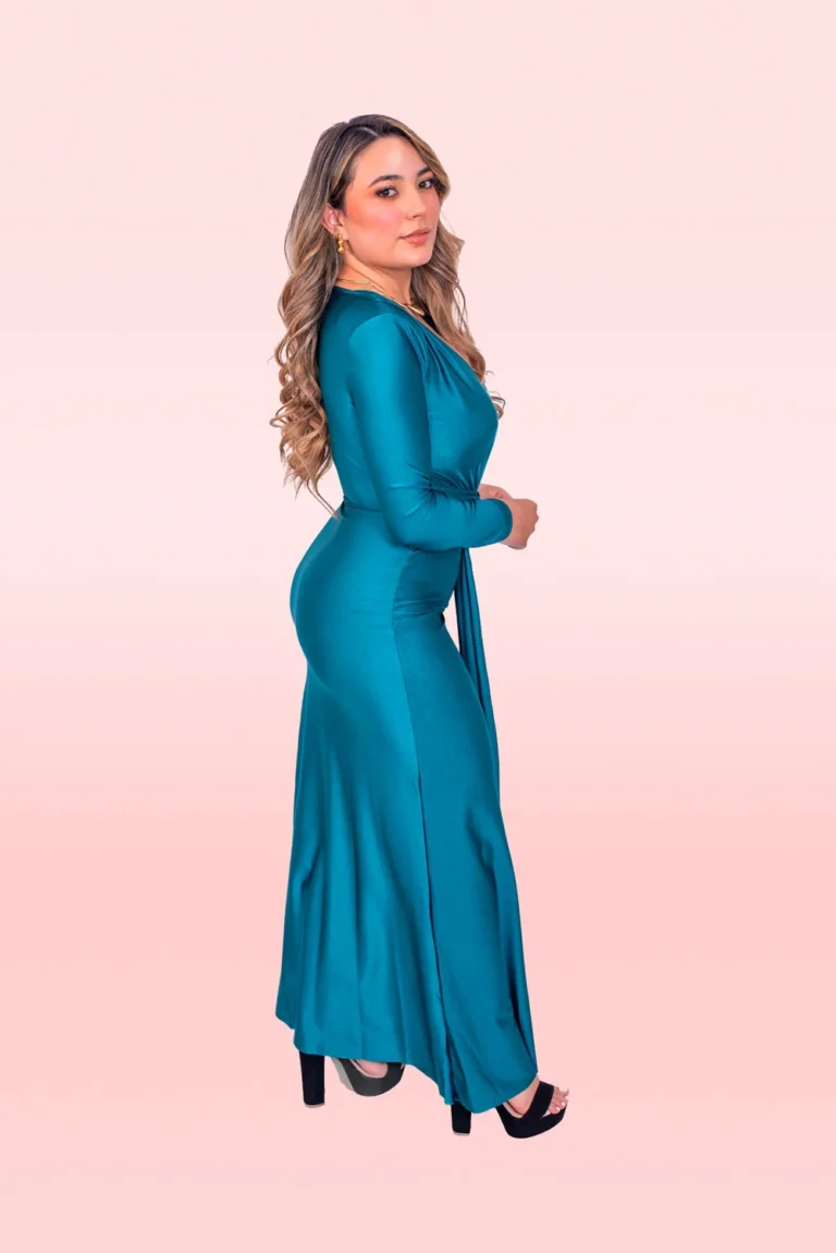 Un diseño espectacular y clásico. Con escote V drapeado en el delantero, abertura en la y falda recta. Mangas rectas y un toque drapeado refinado. Para impactar en cualquier ocasión. Lyra a base de nylon brillante